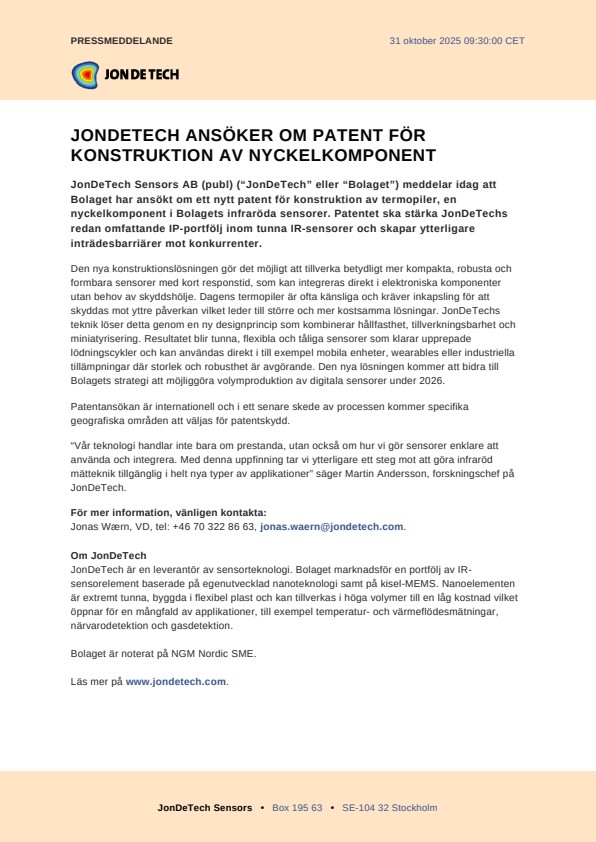 JonDeTech Sensors AB (publ) (“JonDeTech” eller “Bolaget”) meddelar idag att Bolaget har ansökt om ett nytt patent för konstruktion av termopiler, en nyckelkomponent i Bolagets infraröda sensorer. Patentet ska stärka JonDeTechs redan omfattande IP-portfölj inom tunna IR-sensorer och skapar ytterligare inträdesbarriärer mot konkurrenter.