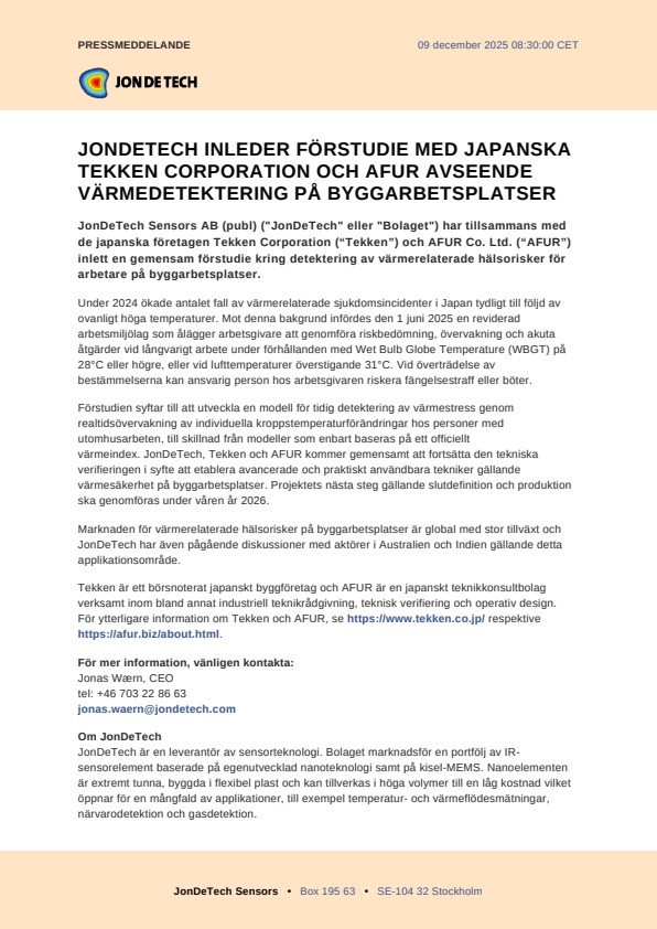 JonDeTech Sensors AB (publ) (“JonDeTech” eller “Bolaget”) har tillsammans med de japanska företagen Tekken Corporation (“Tekken”) och AFUR Co. Ltd. (“AFUR”) inlett en gemensam förstudie kring detektering av värmerelaterade hälsorisker för arbetare på byggarbetsplatser.
