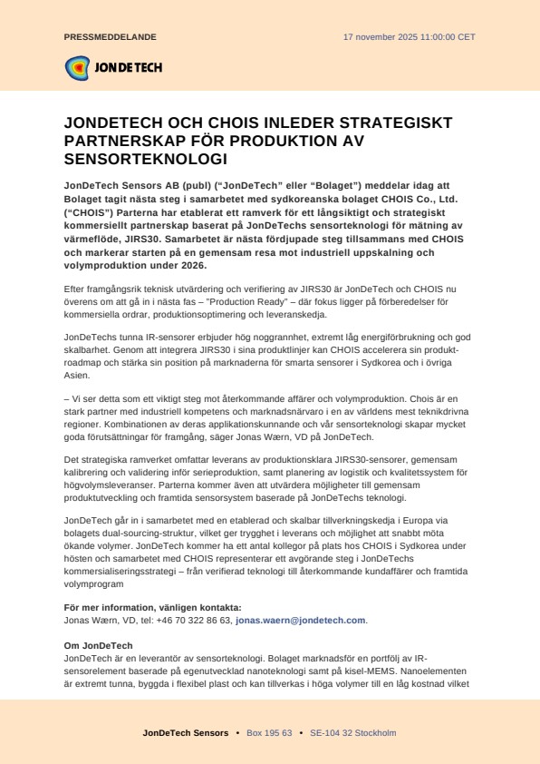 JonDeTech Sensors AB (publ) (“JonDeTech” eller “Bolaget”) meddelar idag att Bolaget tagit nästa steg i samarbetet med sydkoreanska bolaget CHOIS Co., Ltd. (“CHOIS”) Parterna har etablerat ett ramverk för ett långsiktigt och strategiskt kommersiellt partnerskap baserat på JonDeTechs sensorteknologi för mätning av värmeflöde, JIRS30. Samarbetet är nästa fördjupade steg tillsammans med CHOIS och markerar starten på en gemensam resa mot industriell uppskalning och volymproduktion under 2026.