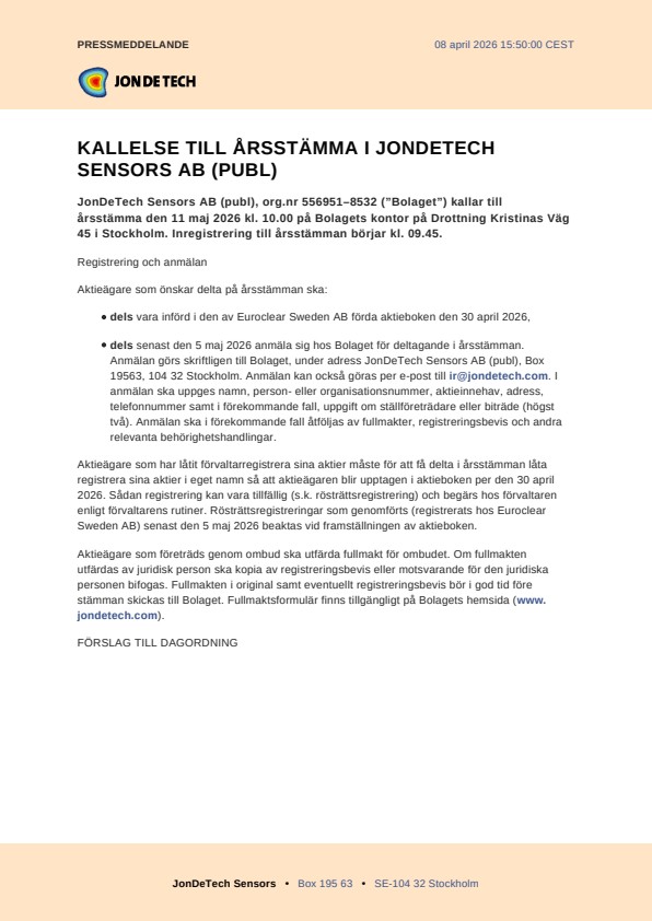 JonDeTech Sensors AB (publ), org.nr 556951–8532 (”Bolaget”) kallar till årsstämma den 11 maj 2026 kl. 10.00 på Bolagets kontor på Drottning Kristinas Väg 45 i Stockholm. Inregistrering till årsstämman börjar kl. 09.45.